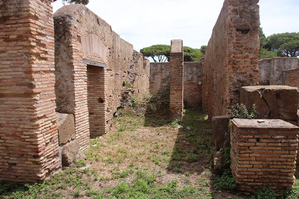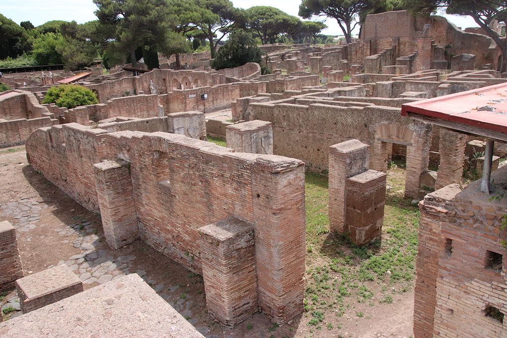 The east half of block V,IV was built in the Hadrianic period (opus mixtum). It consists of large halls with central piers on Via dell'Invidioso to the north and Via della Fortuna Annonaria to the south. In the east wall are high windows. In the centre of the north half is a staircase. In one of the southern rooms are scant remains of masonry basins, perhaps belonging to a little fullery.