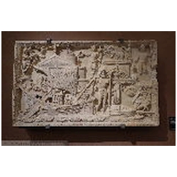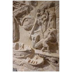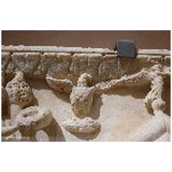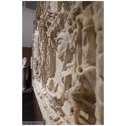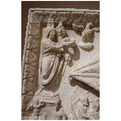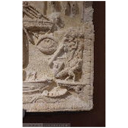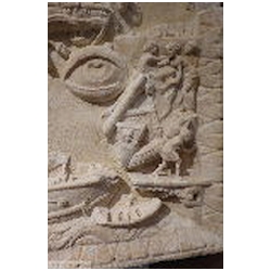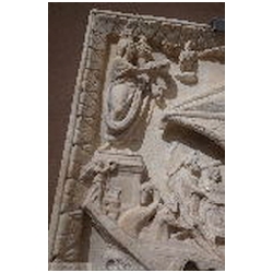 In the top left corner is a female figure, standing on a square pedestal, facing right. She is dressed in a long mantle, reaching the ankles. With her left hand she holds a cornucopiae. Holes are drilled in the upper part of the cornucopiae. With the right hand she holds a wreath. On her head is a lighthouse consisting of three tapering floors, each with an opening in the centre, and with a cylindrical top floor in which a fire is burning. The lighthouse is similar to many depictions of the lighthouse of Portus, so that the figure must be the personification (Genius) of Portus. On the front of the pedestal a building can be seen, consisting of two floors, each with an opening in the centre, on top of which are two T-shaped structures (battlements?). To the right of the figure flies an eagle with outstretched wings. With his claws he holds a wreath. There is an obvious association with the eagle, the bird of Jupiter, who carried the soul of the deceased emperor from the funeral pyre to heaven (apotheosis).