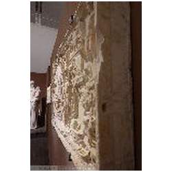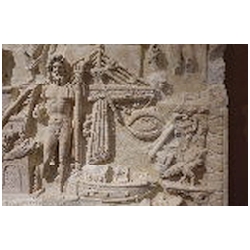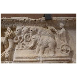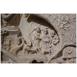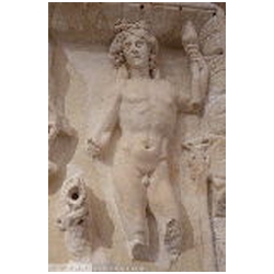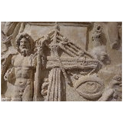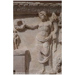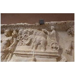 In the upper right corner is the naked Liber Pater - Bacchus, not standing on a base, but merely on the ground. His head is crowned with vine leaves. With his left hand he holds the thyrsus. With his right hand he holds a cup over the head of an animal, presumably a panther. To the left of Liber Pater is a quadriga with elephants. It stands upon a base with a moulded ledge (an arch?). The skin of the elephants is rendered with diagonal lines. The upper part of the base is curved upwards, so that three of the elephants are standing at a higher level. The elephants pull a chariot with an unbearded man wearing a long mantle. In his hair is a wreath. There seems to be a large object in his right hand and a doll in his left. Meiggs has suggested that the latter object is a sceptre terminating in a human head (bust). This kind of sceptre is also seen on coins of Domitianus' second consulship in 73 AD. Meiggs remarks that the Emperor is unbearded and cannot therefore be later than Trajan. Also, Domitian is the first Emperor known to have set up an arch surmounted by an elephant chariot in Rome. Henzen points to a similar sceptre held by Antoninus Pius on a base in Villa Pamfili.