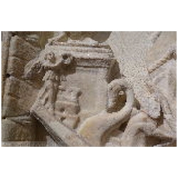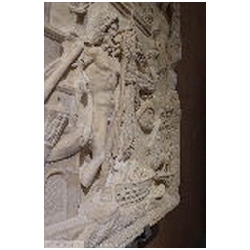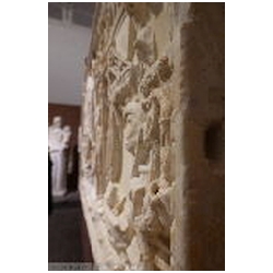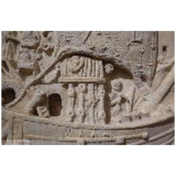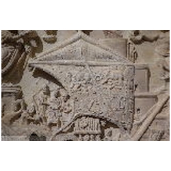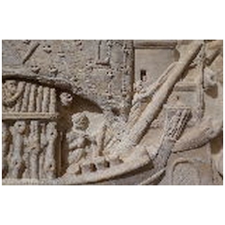 A cargo ship occupies most of the left half of the relief. There are clear similarities with the right ship, and it has been suggested that the ships are the same, at different moments in time. The main mast is hidden behind the main sail, which throws real shadows. On the sail we can see ropes, metal rings and leather bands. A very thick rope runs diagonally across the sail, connecting the main mast - just above the yard - with the deck. Both to the left and to the right of the rope are Romulus and Remus, suckled by the she-wolf, facing left and right respectively. Perhaps we should imagine the figures as being embroidered on the sail. Below the twins, again to the left and right of the rope, are the letters V and L (CIL XIV, 2033). There are no parallels for the abbreviation. The two letters have been explained as V(oti) L(itterae) by Henzen, V(itam) L(ongam) by Cavedoni, V(otvm) L(ibero) by P.E. Visconti, V(enus) L (proper name) by C.L. Visconti, and V(otvm) L(ibens) (S(olvit). For Voti Litterae and Votvm Libero (= to Liber Pater, Bacchus) reference is made to the desciptium of the navigium Isidis by Apuleius (Metamorphoses 11,16): Huius felicis alvei nitens carbasus litteras aureas [or: voti; the manuscripts vary] intextas progerebat: eae litterae votum instaurabant de novi commeatus prospera navigatione ("The resplendent sail of this happy vessel displayed letters embroidered in gold repeating the prayer (votum) for the new sailing season and successful navigation"). In the same book (11,17) is fausta vota ... nauticis navibusque ("auspicious prayers ... for the seamen and ships"; translation E.J. Kenney). On top of the main mast is a winged Victoria, standing on a globe and facing right. She wears a long mantle. In her right hand is a wreath, her left hand cannot be seen.