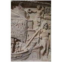 In front of the left part of the right ship is a bearded Neptunus, naked with a mantle hanging over his left shoulder. He is standing on the platform of the lighthouse (which in reality is an island between the two piers of the Claudian harbour). With his left hand he holds a trident. His right hand is lost. The right ship is behind the lighthouse island, so it has entered the basin of Claudius. It is somewhat smaller than the left ship, presumably because it is farther away. As has been said before, there is a great likeness with the left ship. However, the main sail has been furled, and on the prow is a bust instead of a full figure.