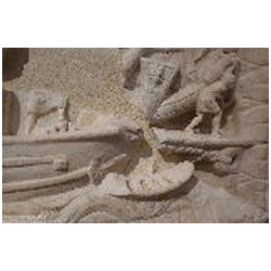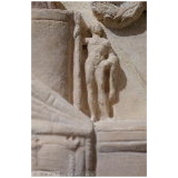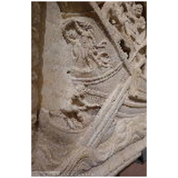 The relief is divided in two parts. The left part is considerably wider than the right part, it takes up about two-thirds of the relief. The left part is symmetrical, due to the two Genii in the upper part, and at first sight relatively simple. The right part is asymmetrical and looks confused. The symmetry of the left part is created by two very large figures in the upper corners, facing each other. In between is a very large ship, much bigger than the same ship in the right scene. It is in front of the equally large lighthouse. The fire of the lighthouse and an eagle flank the tip of the main mast. In the right half two large figures, one in the lower left corner, one in the upper right, contribute to the asymmetry. An enormous eye floating in front of the ship detracts from the realism of the right scene. The balanced and calm nature of the left scene, and also the sheer size of the ship and the lighthouse, invite the viewer to interpret this scene first, postponing the study of the right and apparently more difficult scene.