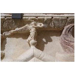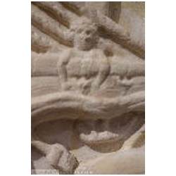 The top of the main mast is egg-shaped, supporting a pinnacle that is pointing, as it were, to the elephant quadriga above. Three sailors are working on the upper part of the ship. One is partially hidden by Neptune's trident, one is seen partly between ropes, and one is hanging on the yard, below which his feet can be seen, resting on a rope. Below the yard a naked sailor is climbing a rope ladder. The lower right part of the ship is much damaged. A large apotropaic eye is floating (or suspended?) in the air. Below the eye the lower part can be seen of a man wearing a mantle and operating the bowsprit as a crane. Again a boat-shaped object is lowered or lifted. Behind the bowsprit and the crane is a rectangle. On the prow is the upper part of the body, a bust, of a person with hair that is very similar to the hair of Liber Pater in the upper right corner.