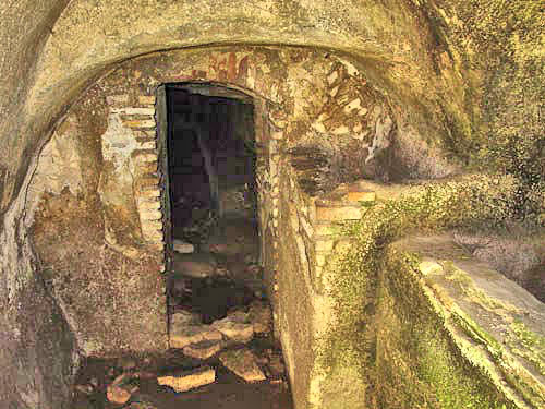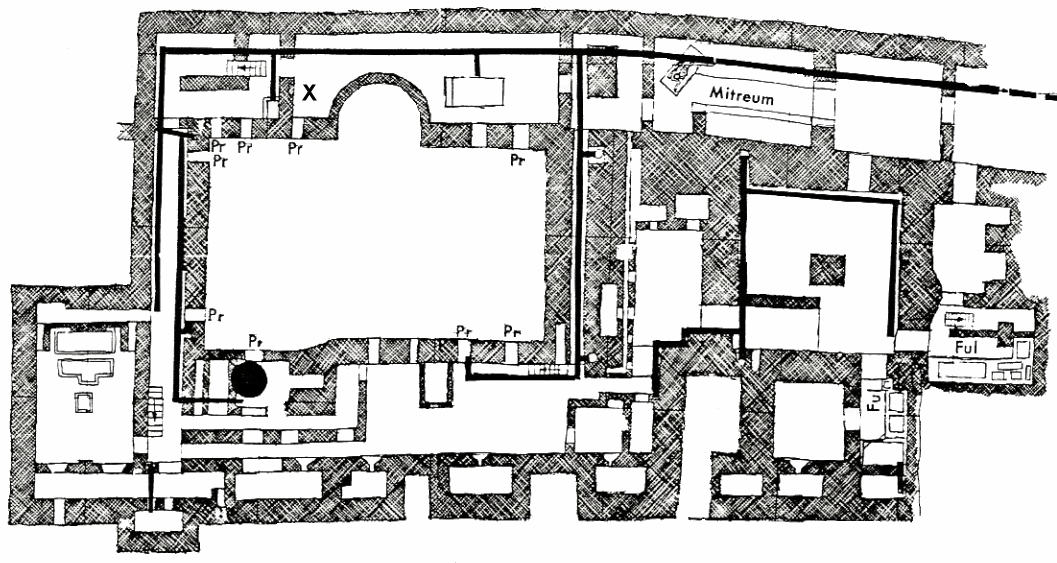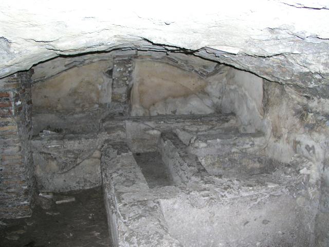 This tiny fulling establishment was installed in the underground service area of the Baths of Mithras. It consists of two rooms with a few basins and benches.