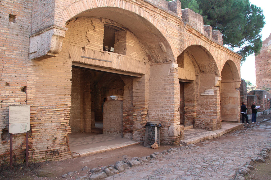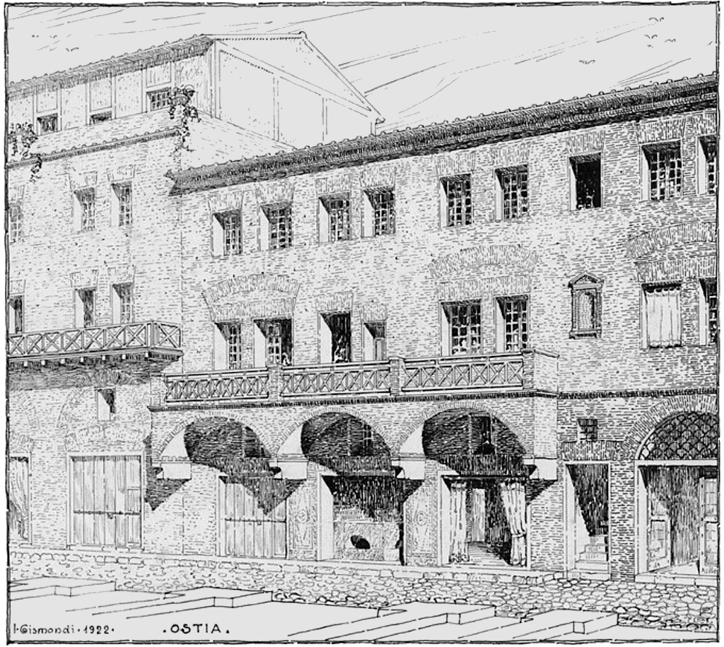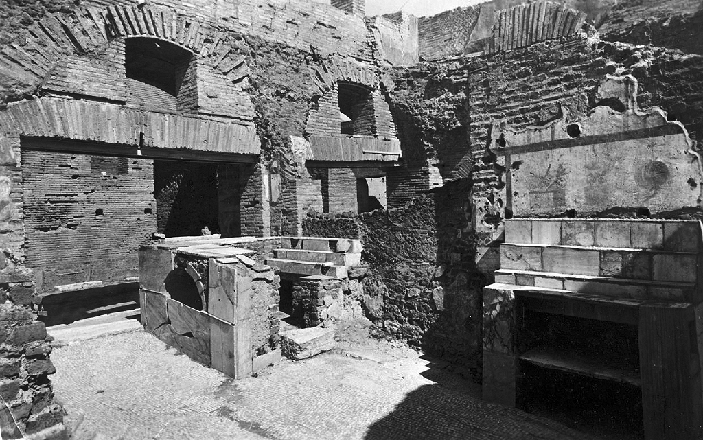 The House of the Wine Bar was investigated in the years 1802-1804. It was re-excavated by Paribeni and Calza during the First World War. It was built in the Trajanic-Hadrianic period (opus mixtum, c. 120 AD). The north facade was decorated by a balcony, supported by arches resting on large travertine consoles. On the first upper floor four windows and a doorway opened onto the balcony. The parapet has not been preserved. The main entrance of the building was corridor 3, with a barrel vault. To the west are shops 1 and 2, to the east is external staircase 4. There is an internal staircase in room 11. The entrance corridor led to courtyard 10. To the west are rooms 8 and 9, to the east rooms 12, 14, 17 and 18. Some of these rooms have thresholds for doors, others have shop-thresholds. Four doors in the east wall of room 8 suggest the presence of (wooden?) partition walls. In the back wall of this room is a wall-niche. Most of the dividing walls of the rooms to the east are secondary. The rooms apparently had a commercial function that may have varied in the course of time. Along the Decumanus is a row of shops (20-25). In the east half of the building is another courtyard, nr. 13. It is decorated by a round marble basin on a foot. In the centre of the floor a square marble basin was set, with a lead pipe for a vertical water jet. Another large basin is in the north-west part. Along the east wall is a bench, where visitors of a bar to the north could sit down. A staircase on the west side leads to a small underground room. In the third century the staircase was covered by a roof (opus vittatum). In the east wall of the stairwell is a window, on the inside paintings have been preserved, showing vegetation and birds. The roof of the underground room has a hole providing light and was finished with terracotta discs. Opposite the entrance is a wall-niche with an elaborate shelf. The room, with a surface of only some two square meters, is too small to have been a cellar for the cold storage of foodstuffs, as some maintain (cellars are very rare in Ostia because of the high level of the ground water). More likely it was a cult room.