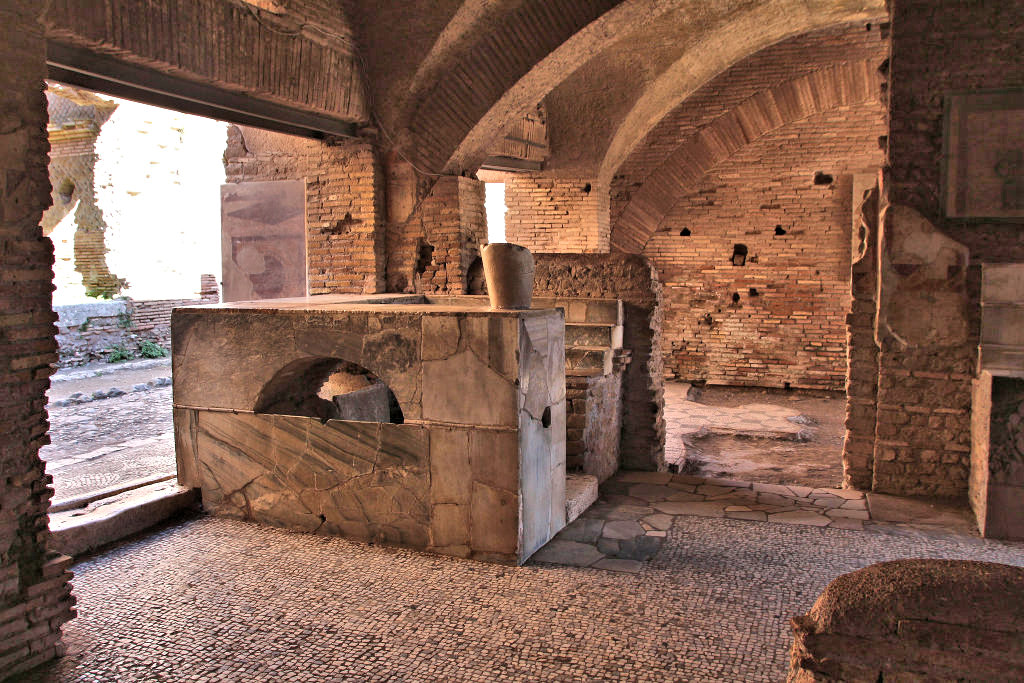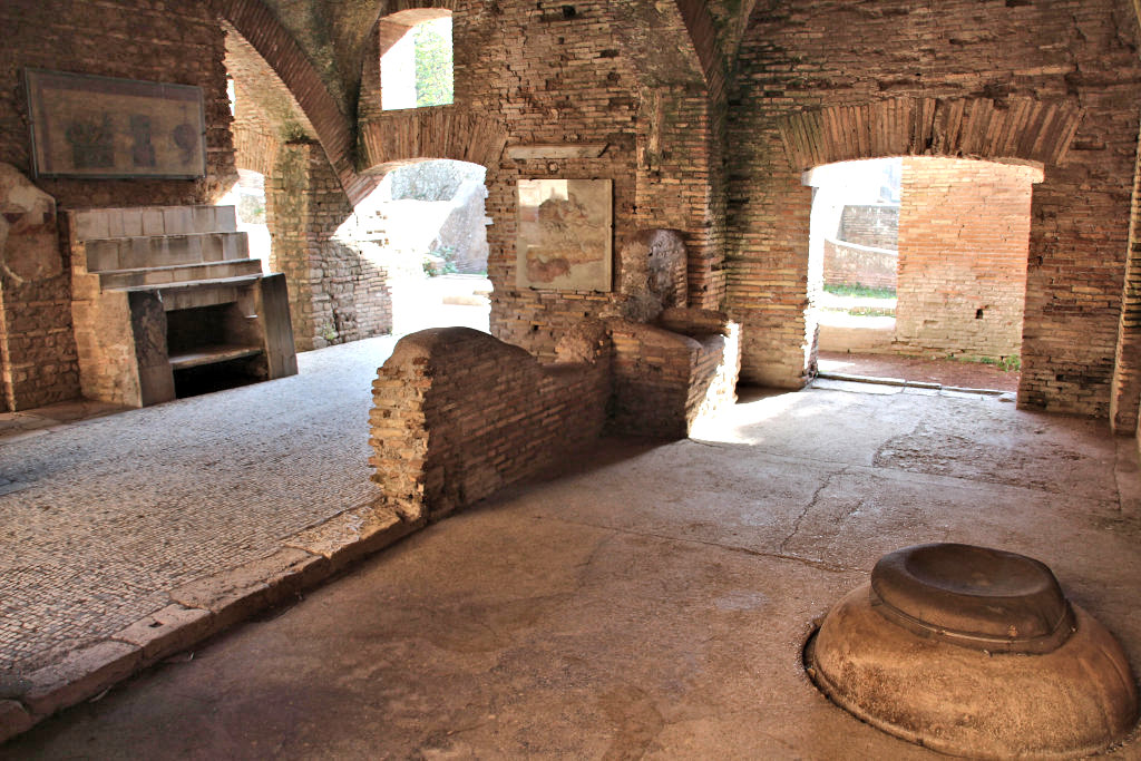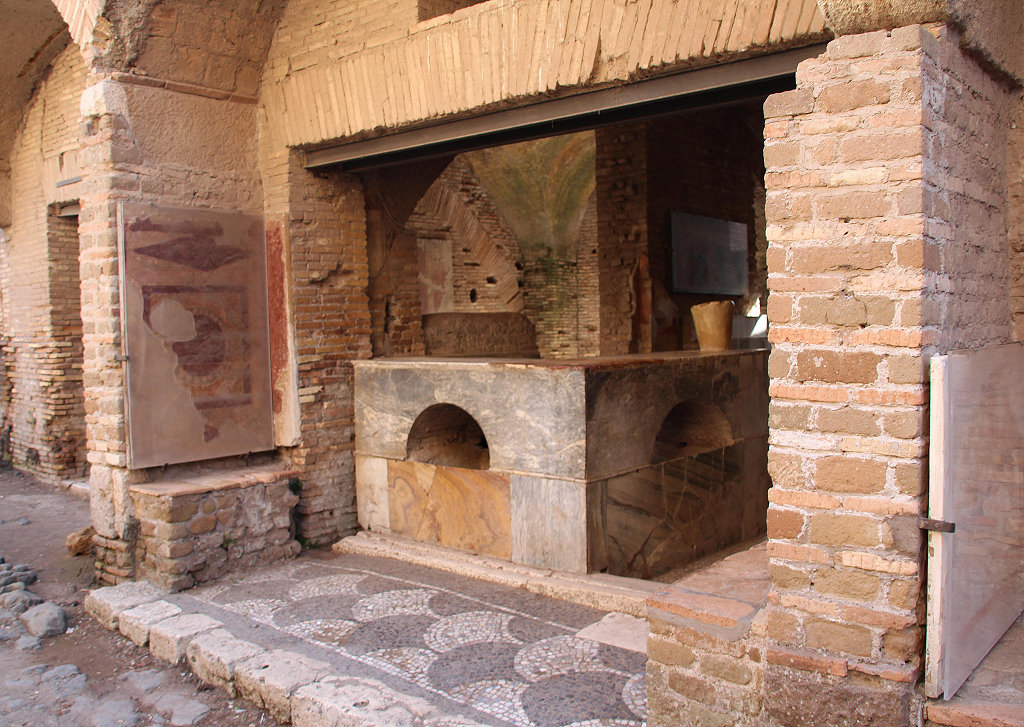A marble construction was set against the central part of the east wall of room 6: a side-table, below which is a shelf and above which are three stepped shelves. Above the construction is a painting in which food and other objects related to the bar are depicted. The precise identification of the objects remains difficult. From left to right we may see: green olives; a turnip; eggs or peaches in a glass with water; two red cheese or watermelons or cymbals hung from a nail. In front of the east wall of room 5 a stove for heating water or for cooking was found. Near the west wall is a buried storage jar (dolium defossum) that once contained wine or olive oil. Room 7 may also have belonged to the bar. The floor is of basalt blocks, and this room may therefore have been a stable in the final phase. Remains of a furnace were found, that could unfortunately not be preserved by the excavators. Among the finds from the room is a metal slave collar that was worn by a runaway slave. It carries the inscription: