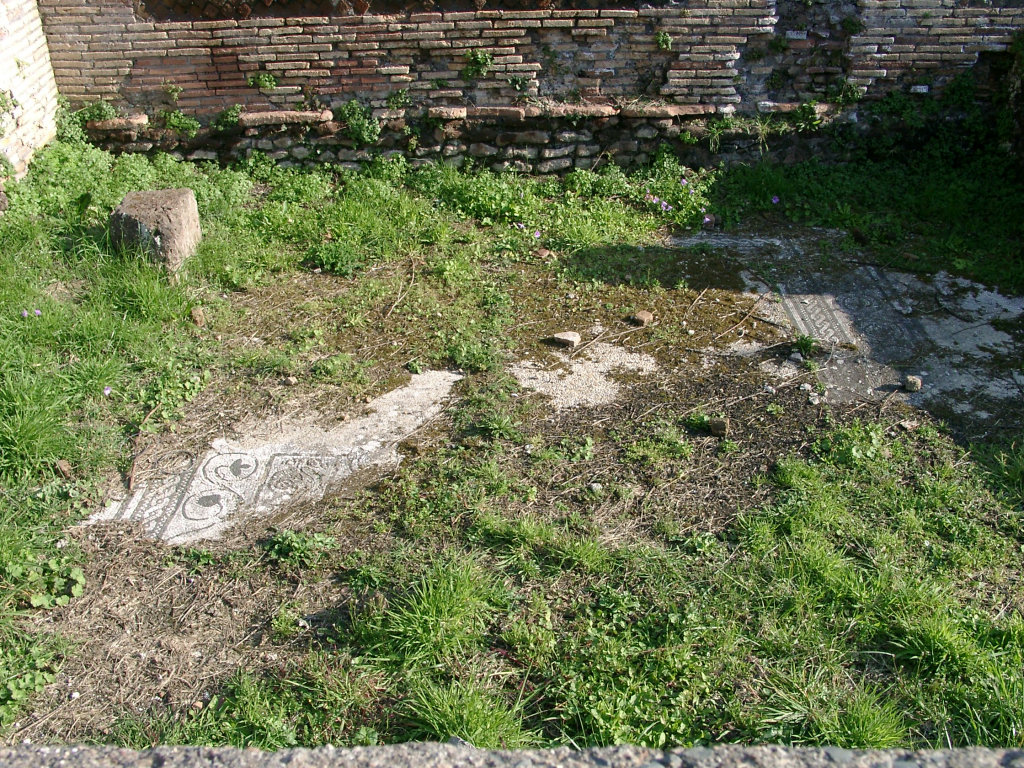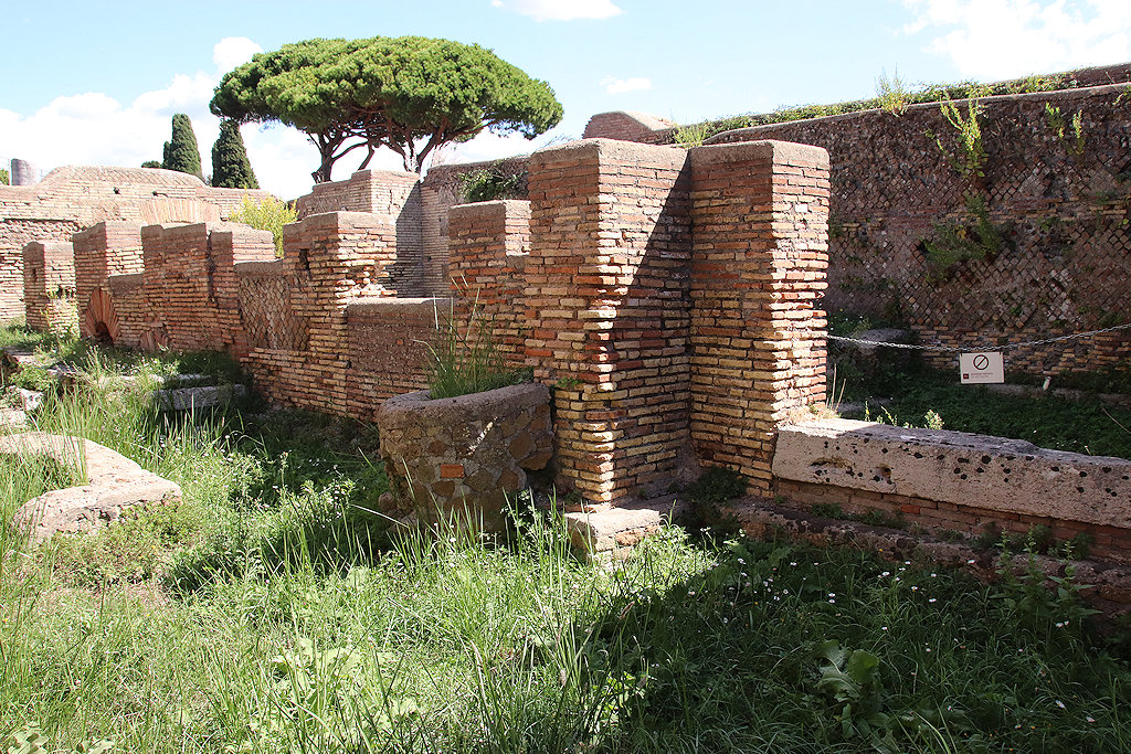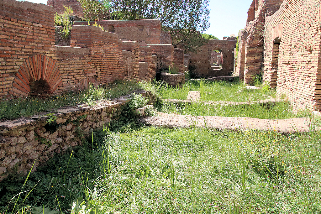 The House behind the Curia, also called Casa Basilicale (Basilical House) was erected during the reign of Hadrian, c. 120 AD (opus mixtum). The remains of three small houses from the republican period were found below it. The street to the north was therefore called Via delle Casette Repubblicane, Road of the Republican Houses. The facade had a layer of white plaster. Irregular remains of red paint were found, pointing to (commercial?) texts. In the centre of the facade is the entrance vestibule, next to a staircase. In the facade, flanking the vestibule, are two empty recesses for terracotta reliefs. These were either shop signs or religious reliefs with depictions of deities protecting the building and its inhabitants. Along the road are six shops. They were interconnected. The doors between the eastern shops were later blocked. The shops had a pavement of opus spicatum. To the south is a long courtyard, open to the sky except for the central part, that, like a bridge, connected the upper floors of the northern and southern part. The courtyard too was paved with opus spicatum. In the west wall is a huge hole, made at an unknown point in time by people in search of marble objects. In the eastern half of the courtyard is a well. Three rooms to the south received light from the courtyard through windows. Remains of mosaic floors suggest that these rooms were habitations. |